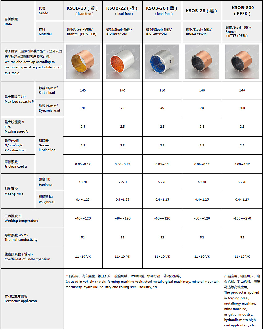 According to the different working conditions and environmental protection, the POM or PEEK layer with different polymer filler, Surface tin or copper plating. product range includes KSOB-20(yellow)、KSOB-22(orange)、KSOB-26(blue)、KSOB-28(black)、KSOB-800(PEEK).