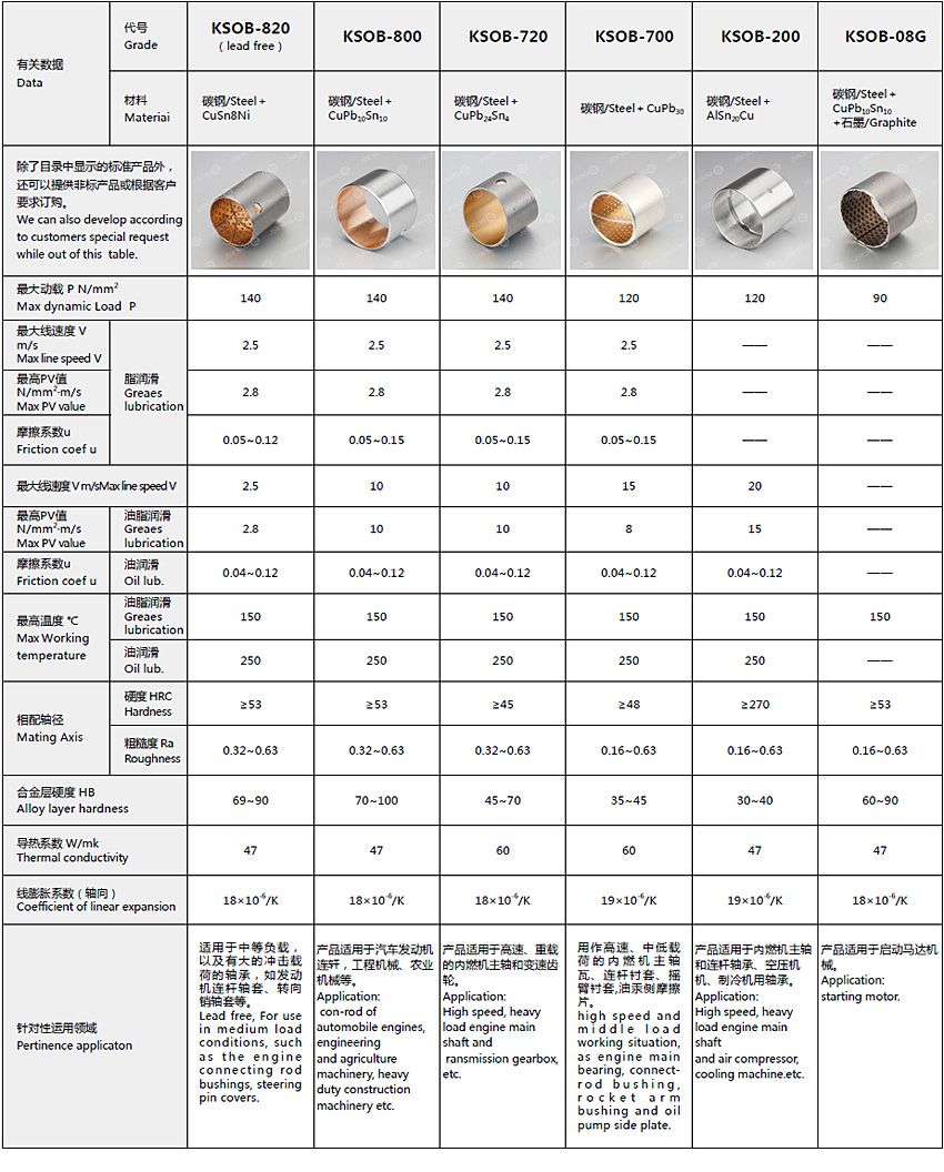 双金属复合轴承以优质低碳钢为基体,表面烧结具有低摩擦特性的铜合金(CuPb10Sn10、CuPb6Sn6Zn3、CuPb24Sn4、CuPb30、AlSn20Cu、CuSn8Ni)作为轴承的耐磨层,铜合金表面可以根据使用工况需要加工出各种类型的油槽、油孔、油穴等,以适合于无法持续加油或者难以加油的场合。材料通过二次烧结二次挤压可以得到很好的接合强度和最佳的承载能力。
